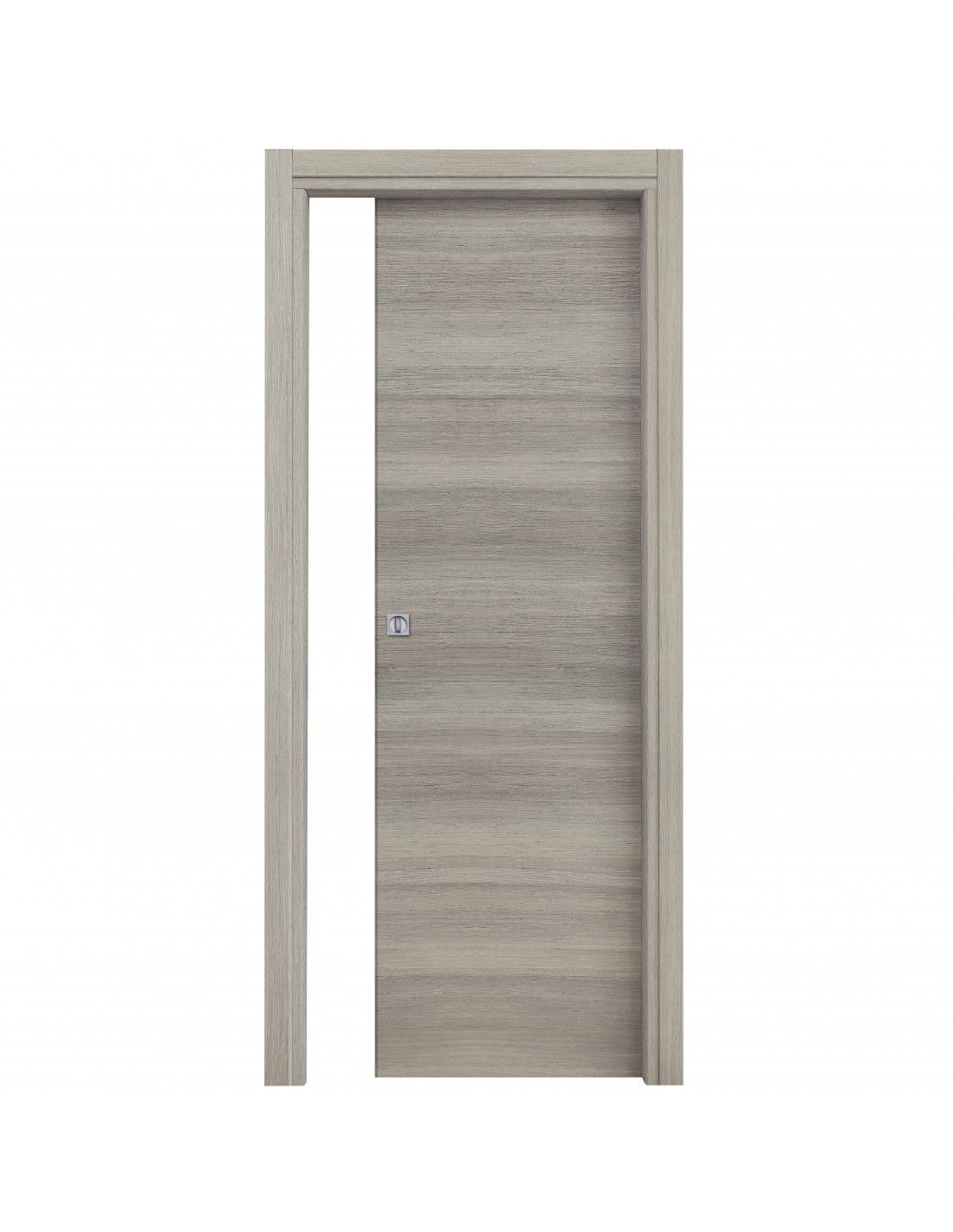 Anta tamburata di spessore nominale 44 mm, riempimento in cartoncino trattato, placcato con pannelli in MDF spessore 3/4 mm nobilitato con carta finish. Telaio piatto in MDF di spessore 40 mm con guarnizione di battuta di gomma. Coprifilo telescopici esterno ed interno in Mdf da 65 mm con aletta utile da 8 mm. Ferramenta serratura. Scorrevole. Dimensioni 210x60 cm. Colore Rovere Grigio