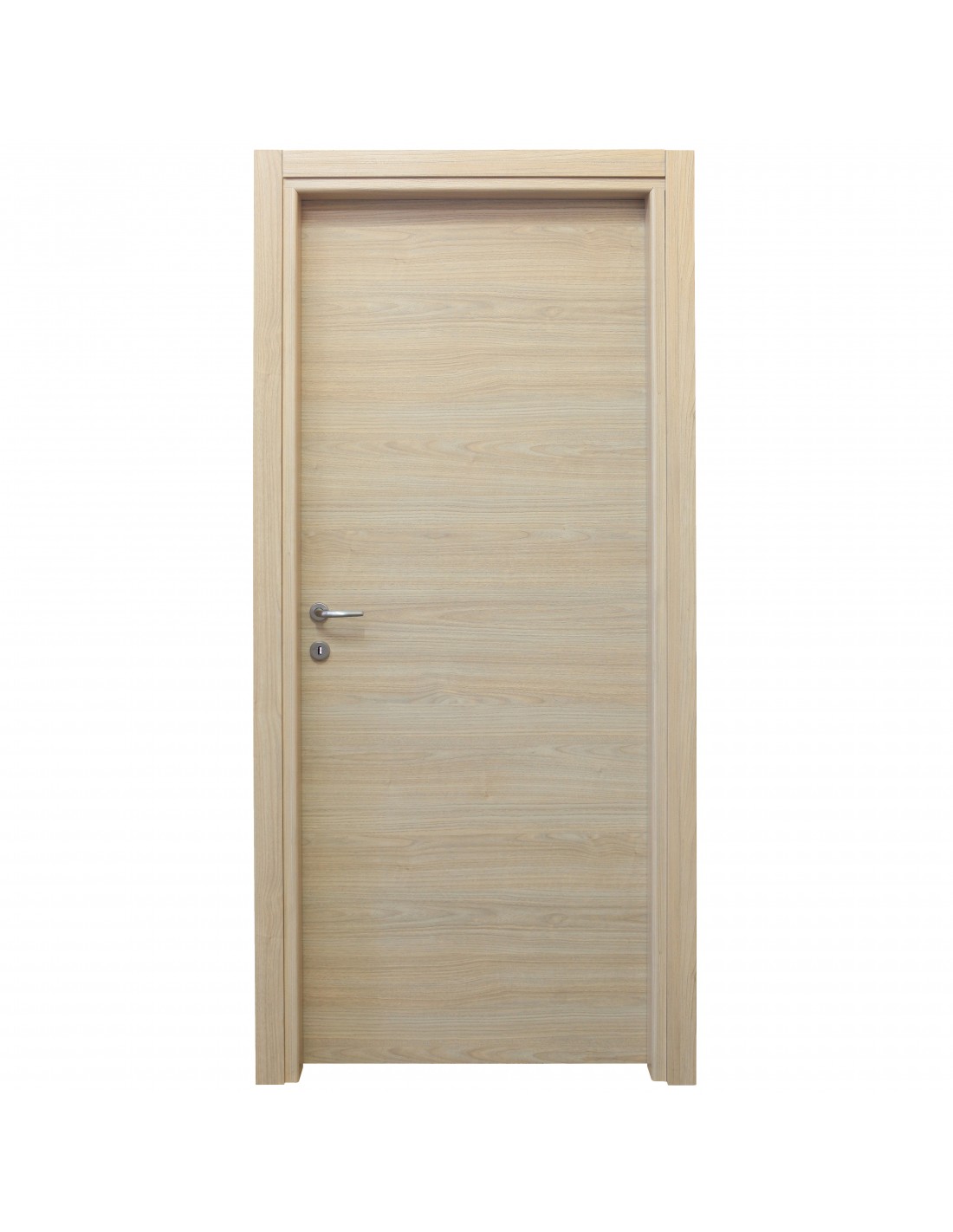 Anta tamburata di spessore nominale 44 mm, riempimento in cartoncino trattato, placcato con pannelli in MDF spessore 3/4 mm nobilitato con carta finish. Telaio piatto in MDF di spessore 40 mm con guarnizione di battuta di gomma. Coprifilo telescopici esterno ed interno in Mdf da 60 mm con aletta utile da 8 mm. Ferramenta serratura mediana. Anuba reversibili. Dimensioni 210x90 cm. Colore Rovere sbiancato