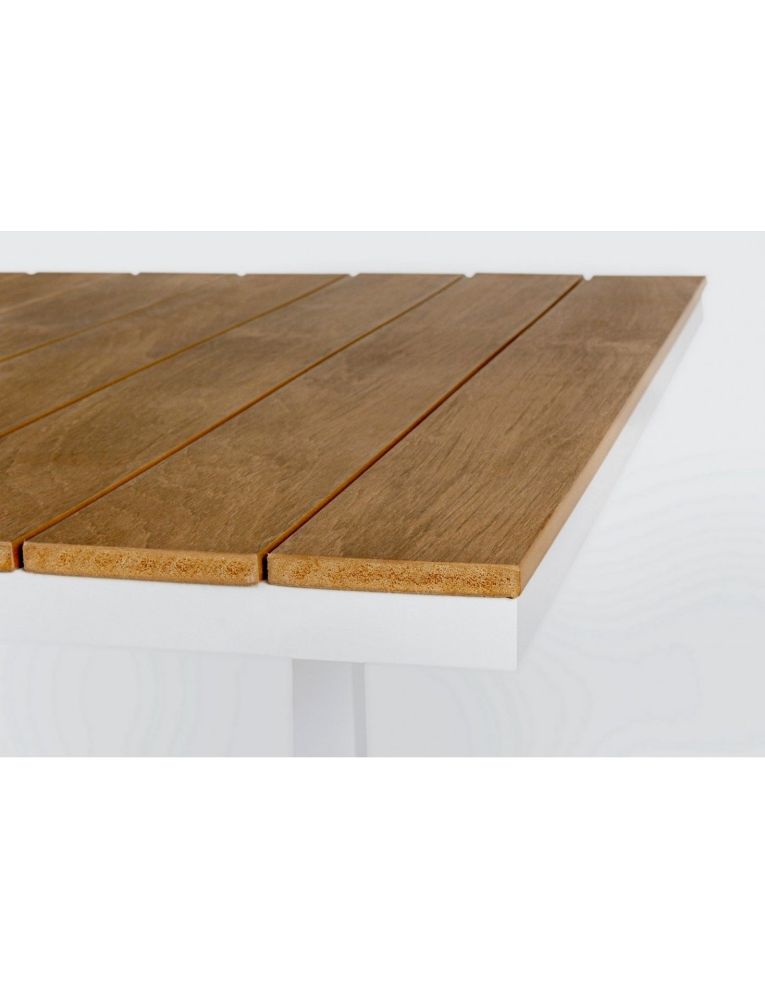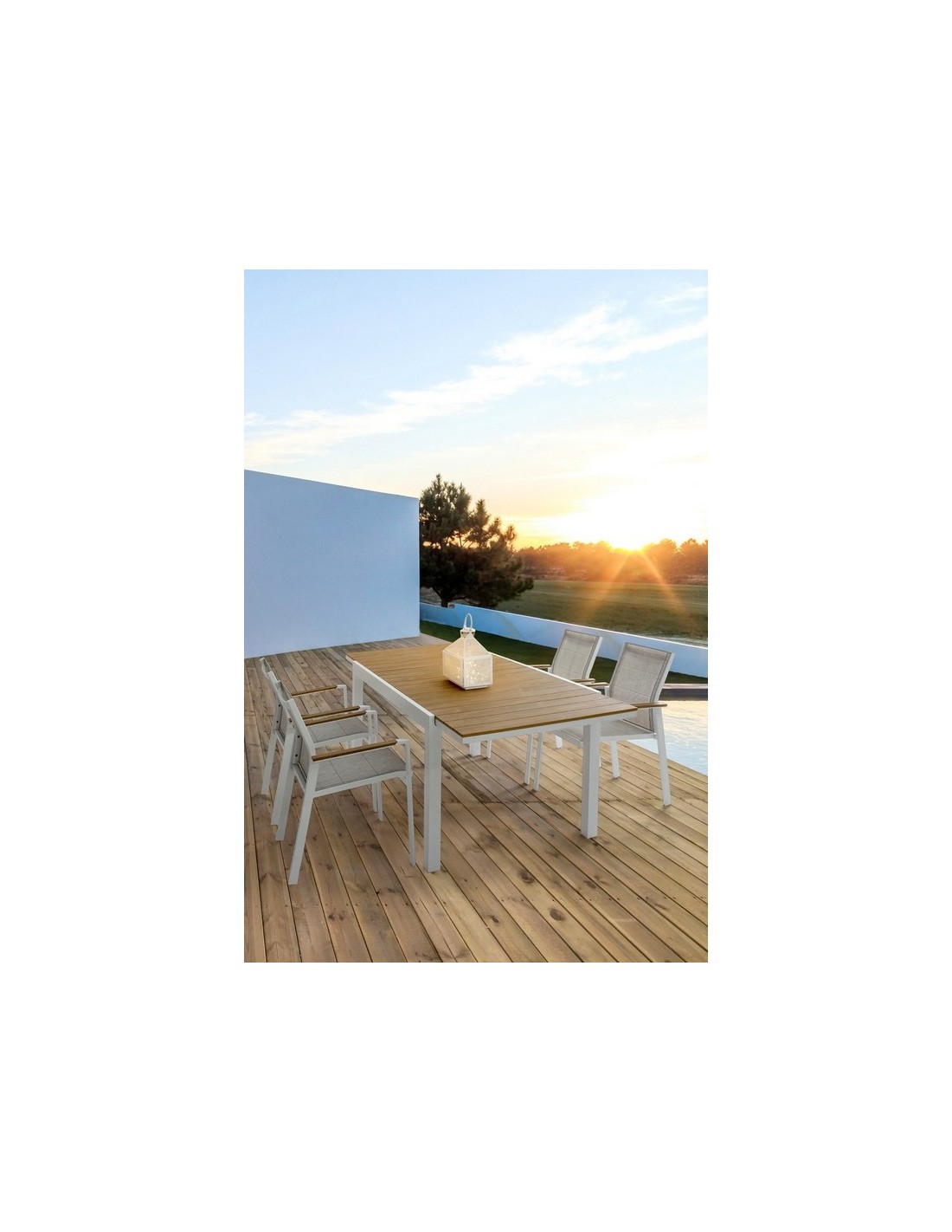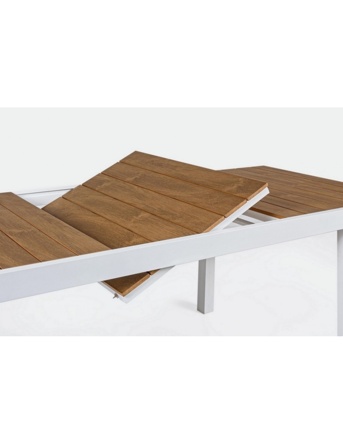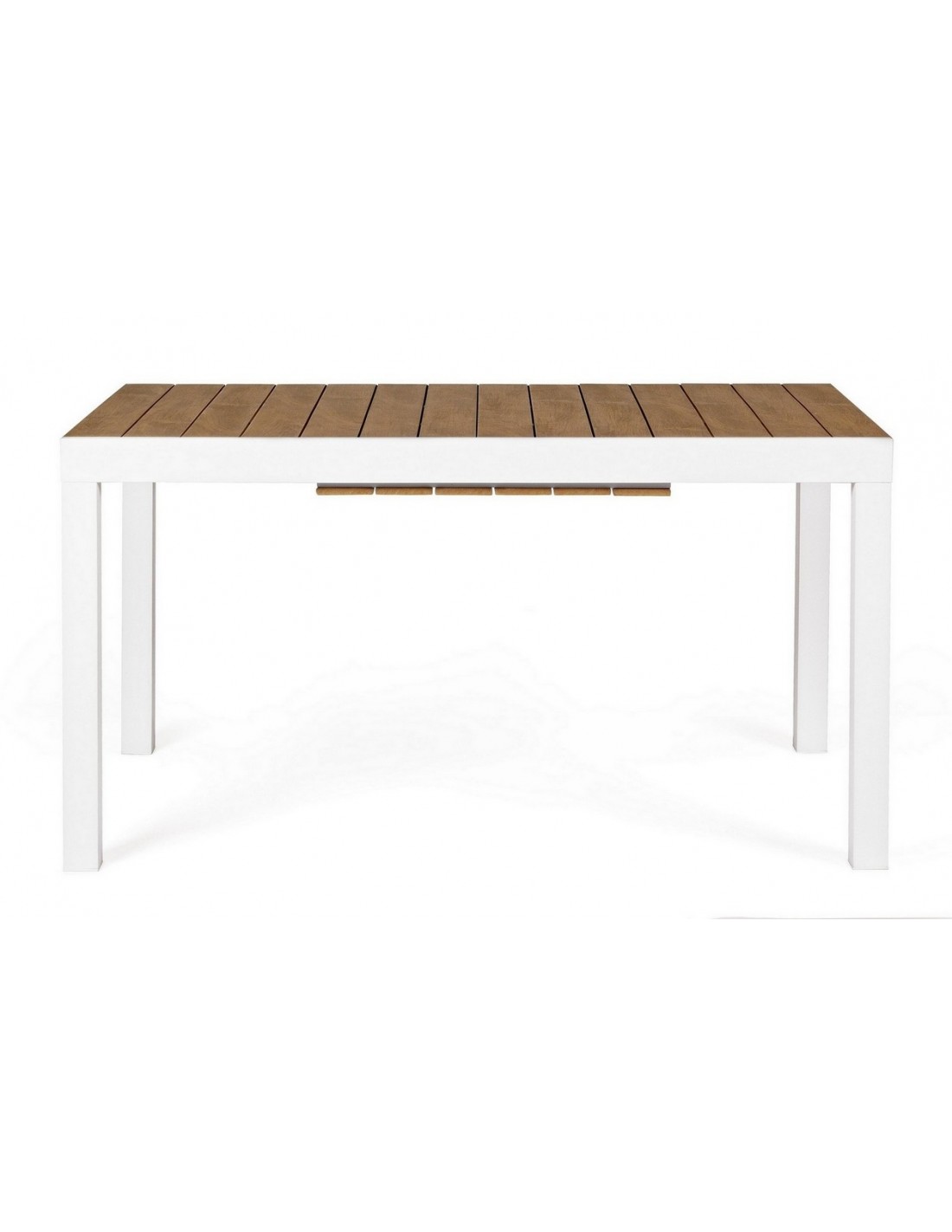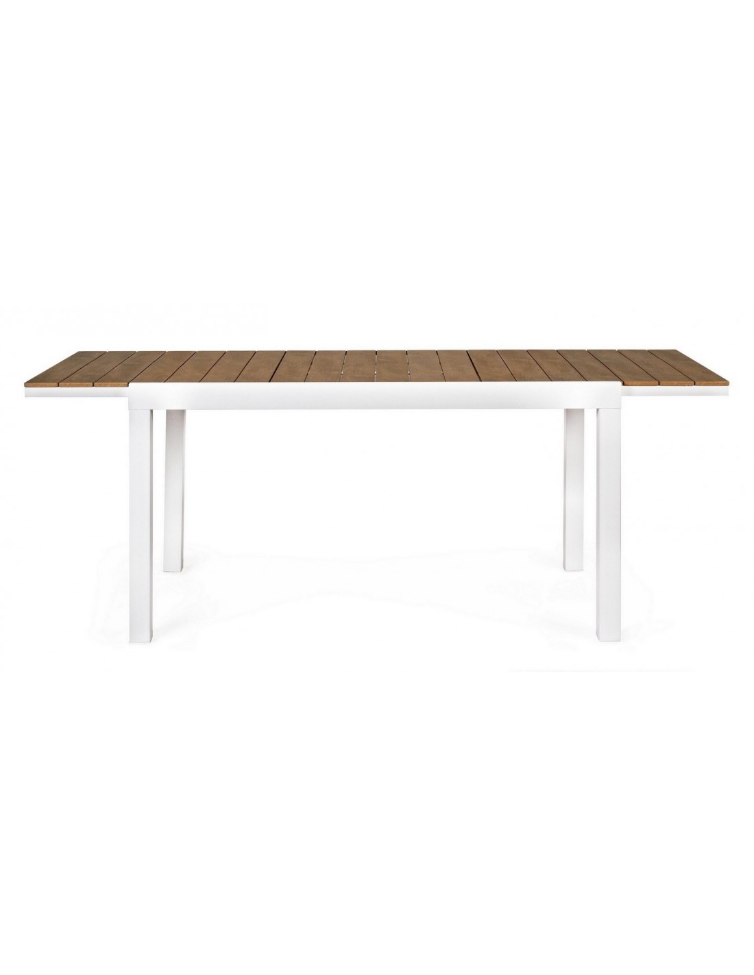 Il tavolo allungabile Elias della Bizzotto ha una struttura in alluminio verniciato a polvere, con piano in doghe in polywood colore teak, materiale altamente tecnologico ed innovativo che lo rende resistente alle intemperie e agli agenti atmosferici.