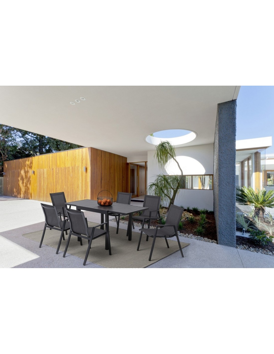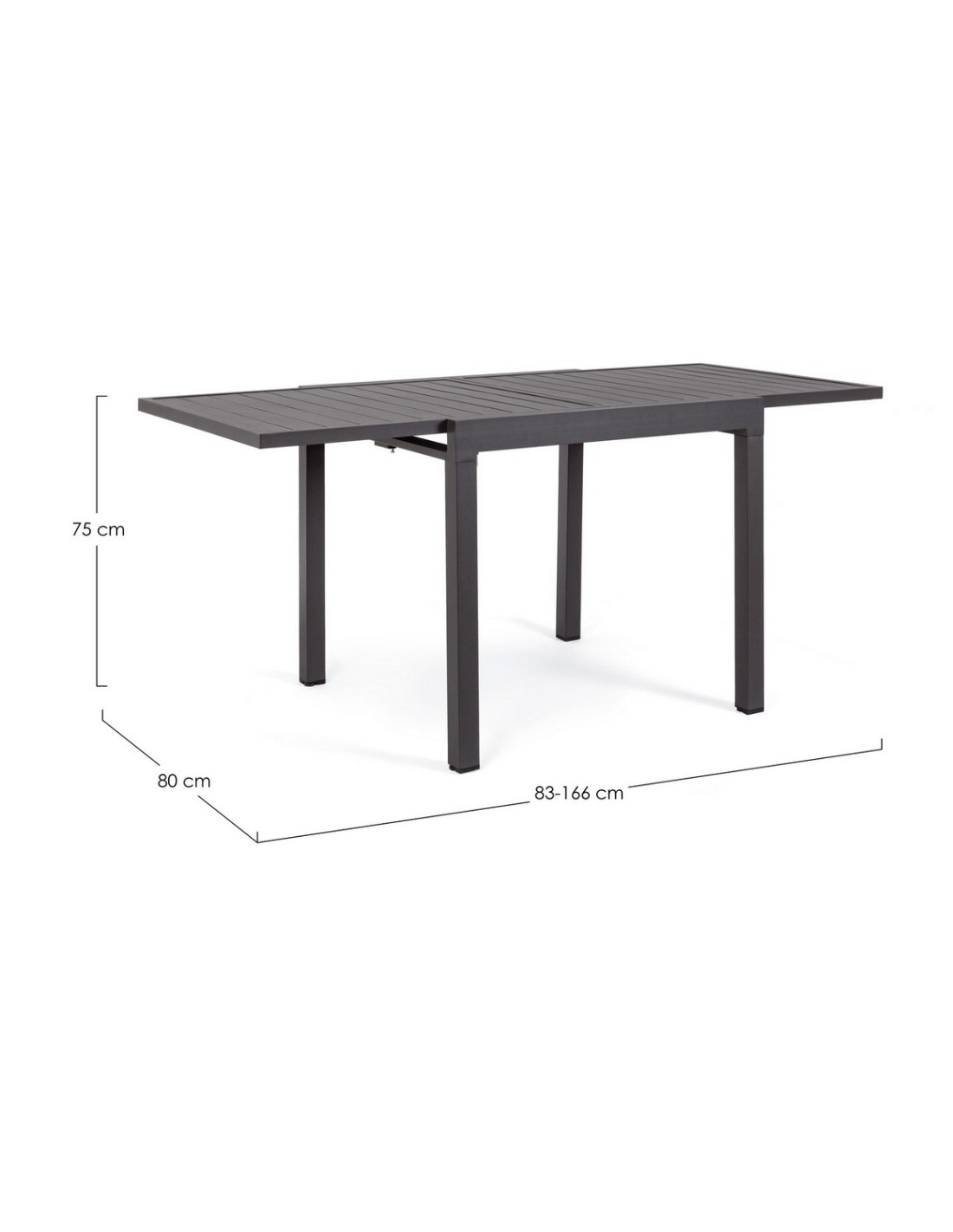 Il Tavolo Pelagius Antracite della Bizzotto è in alluminio verniciato a polvere, con piedini regolabili per un maggiore confort. E' ideale per spazi esterni e grazie alla sua lunghezza massima di 166 cm può ospitare fino a 6 persone.