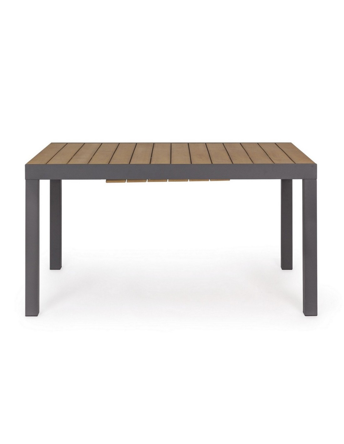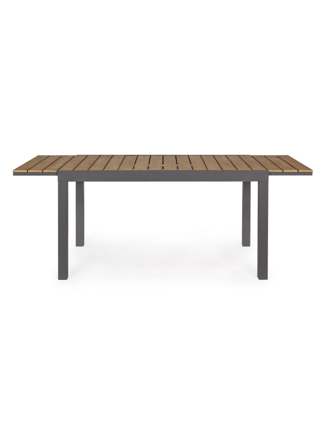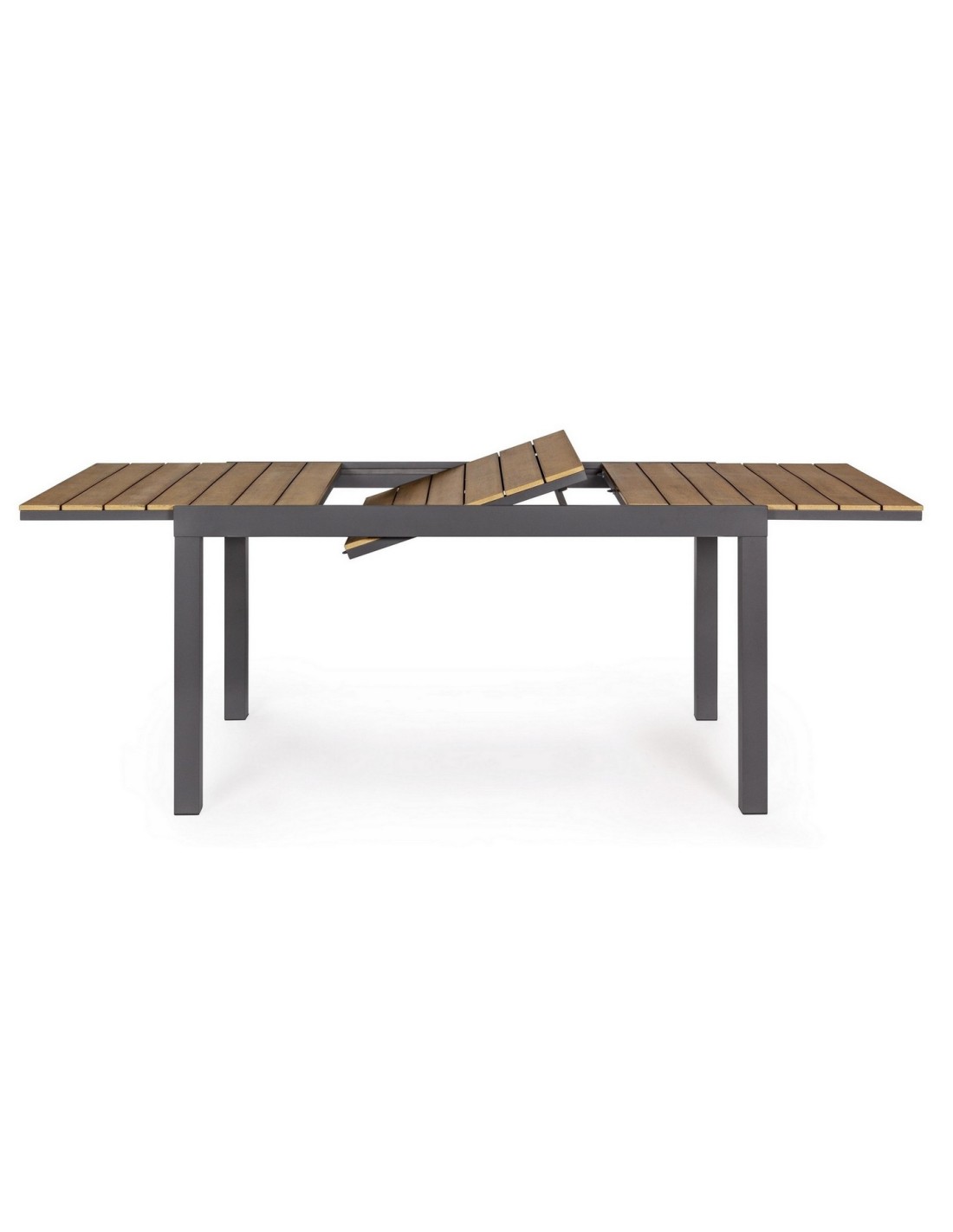 Il tavolo allungabile Elias della Bizzotto ha una struttura in alluminio verniciato a polvere, con piano in doghe in polywood colore teak, materiale altamente tecnologico ed innovativo che lo rende resistente alle intemperie e agli agenti atmosferici.