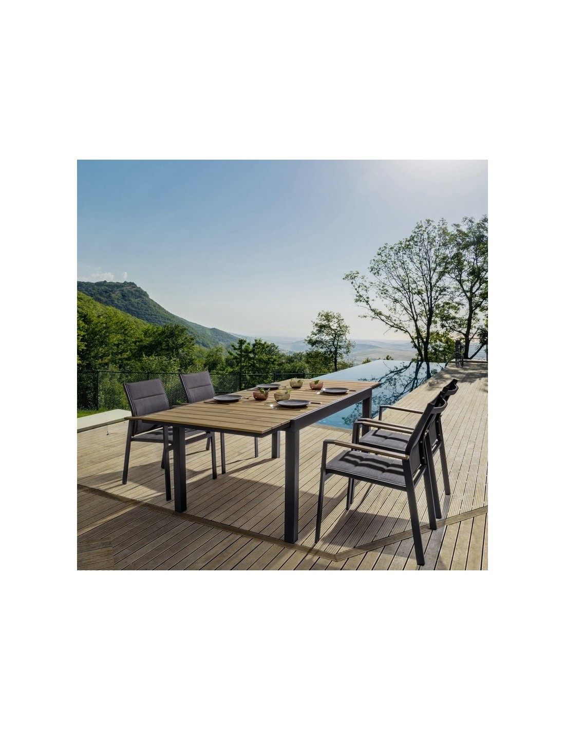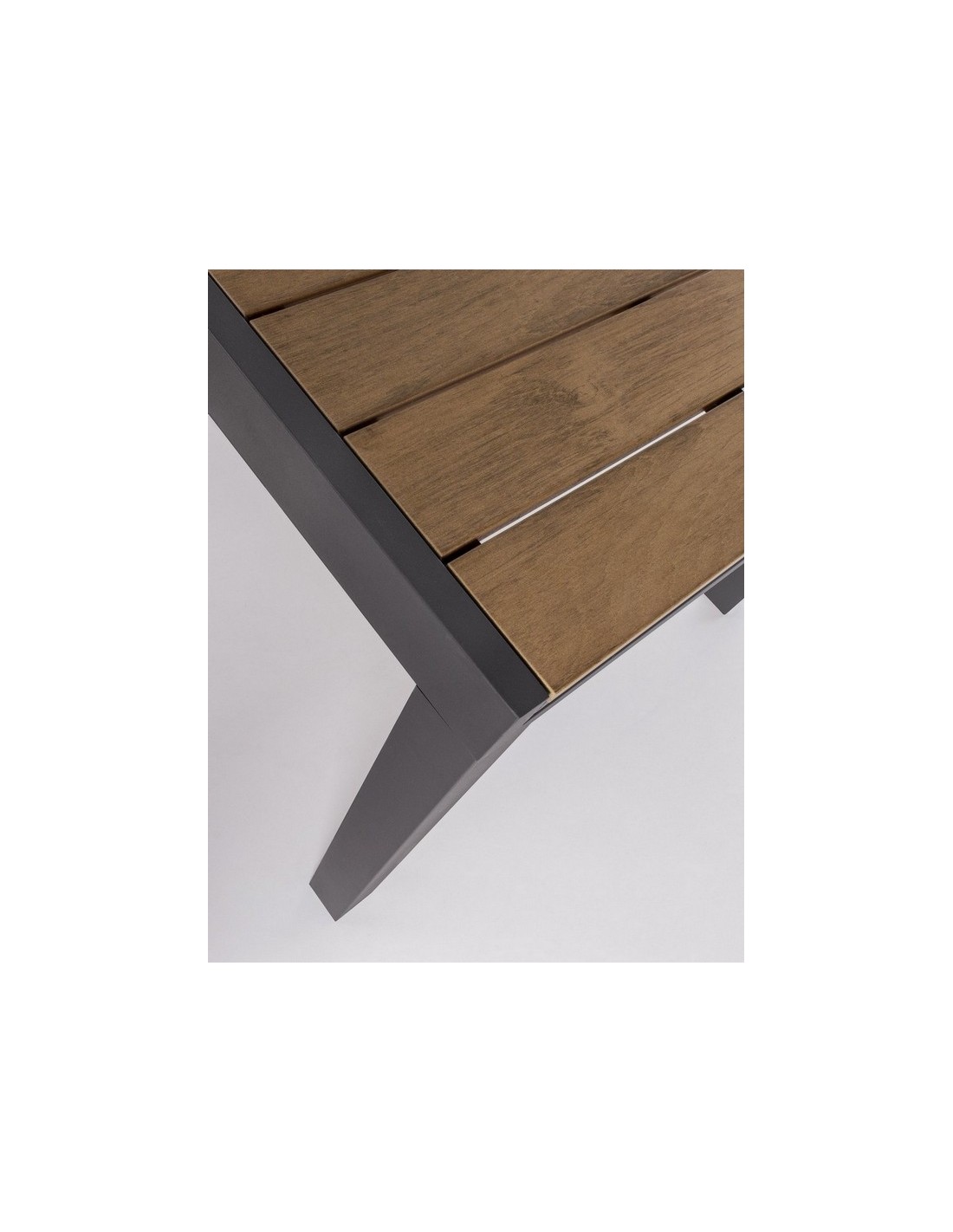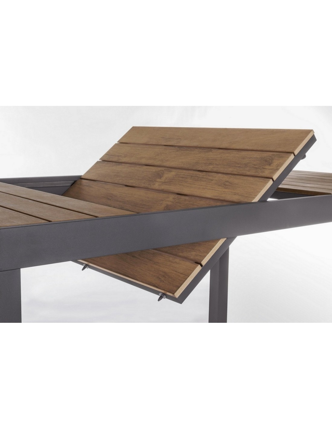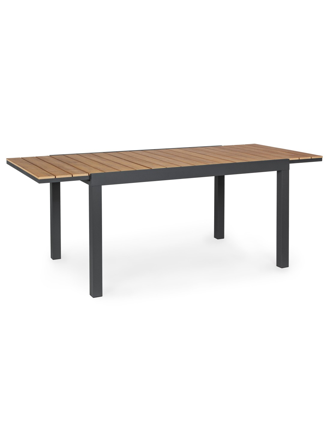 Il tavolo allungabile Elias della Bizzotto ha una struttura in alluminio verniciato a polvere, con piano in doghe in polywood colore teak, materiale altamente tecnologico ed innovativo che lo rende resistente alle intemperie e agli agenti atmosferici.