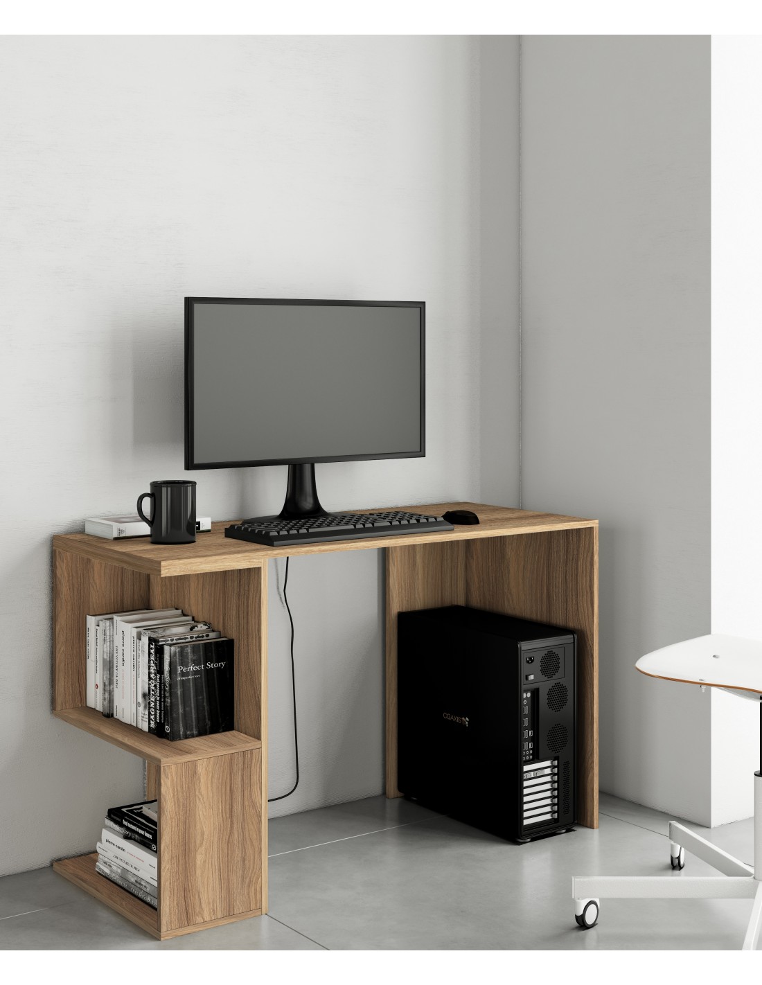 Composta da un piano di lavoro che poggia su due pannelli in truciolare e comodi vani portaoggetti. Da montare. Dimensioni 117 x 50 x h 73,5 cm. Colore rovere barly.
