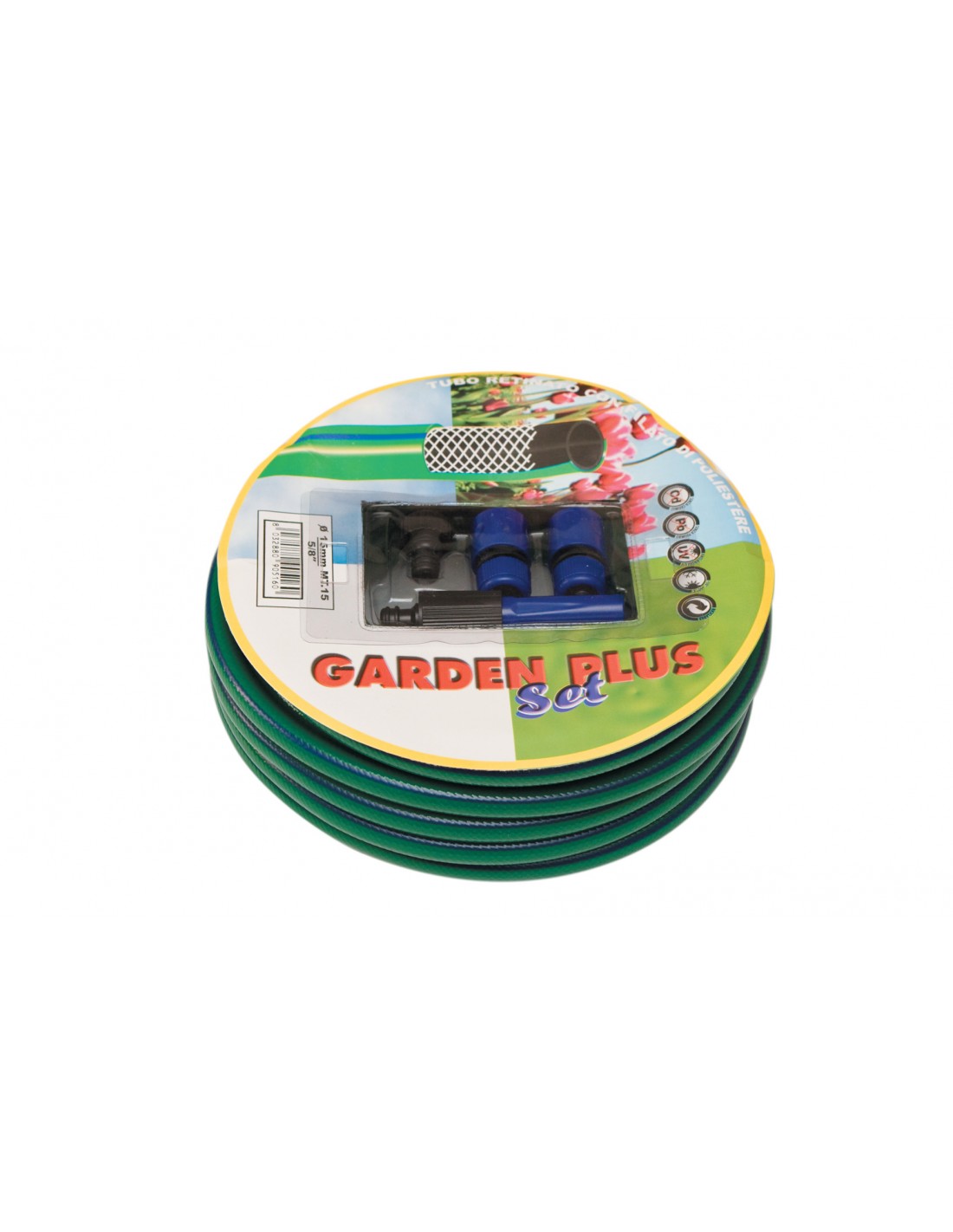 Il tubo da giardino Garden Plus è un kit composta da 15 mt di tubo retinato a 3 strati da 5/8, una lancia, e tutti i raccordi che servono per agganciarlo al rubinettto. E' resistente alle intemperie e a temperature che vanno da -10°a + 60°