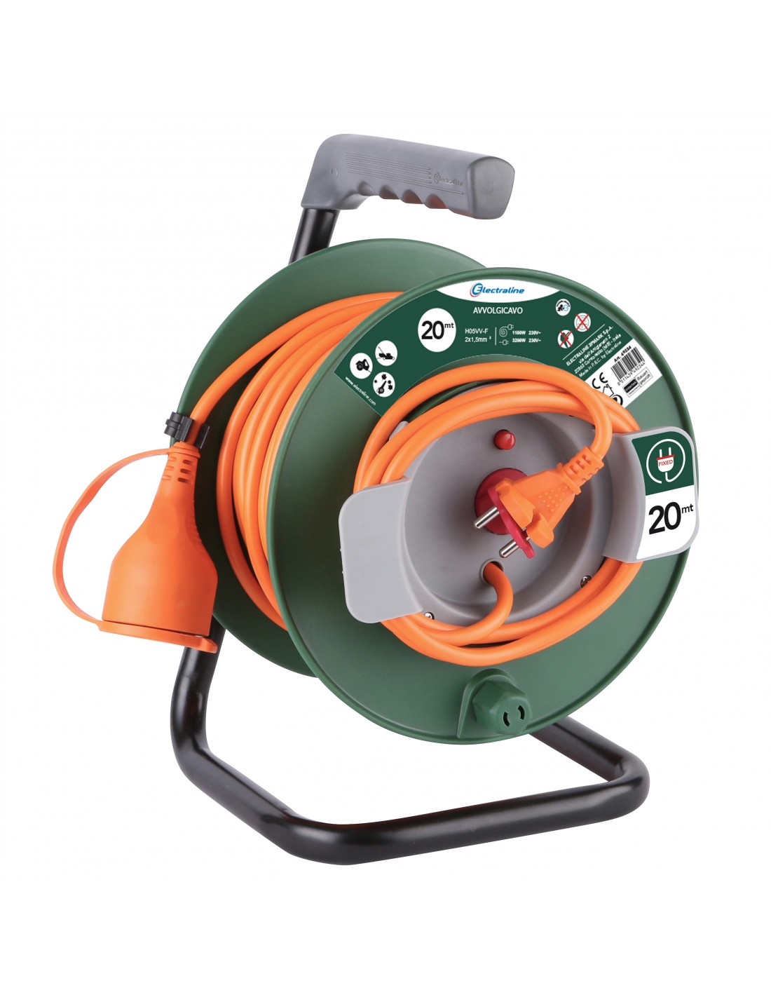 da giardino con rullo realizzato in materiale termoplastico, manico e cavalletto metallico. Sezione filo 2x1,5 mm2 H05VV-F con protezione. Lunghezza cavo 20 m. Spina schuko al tamburo, presa schuko al terminale.