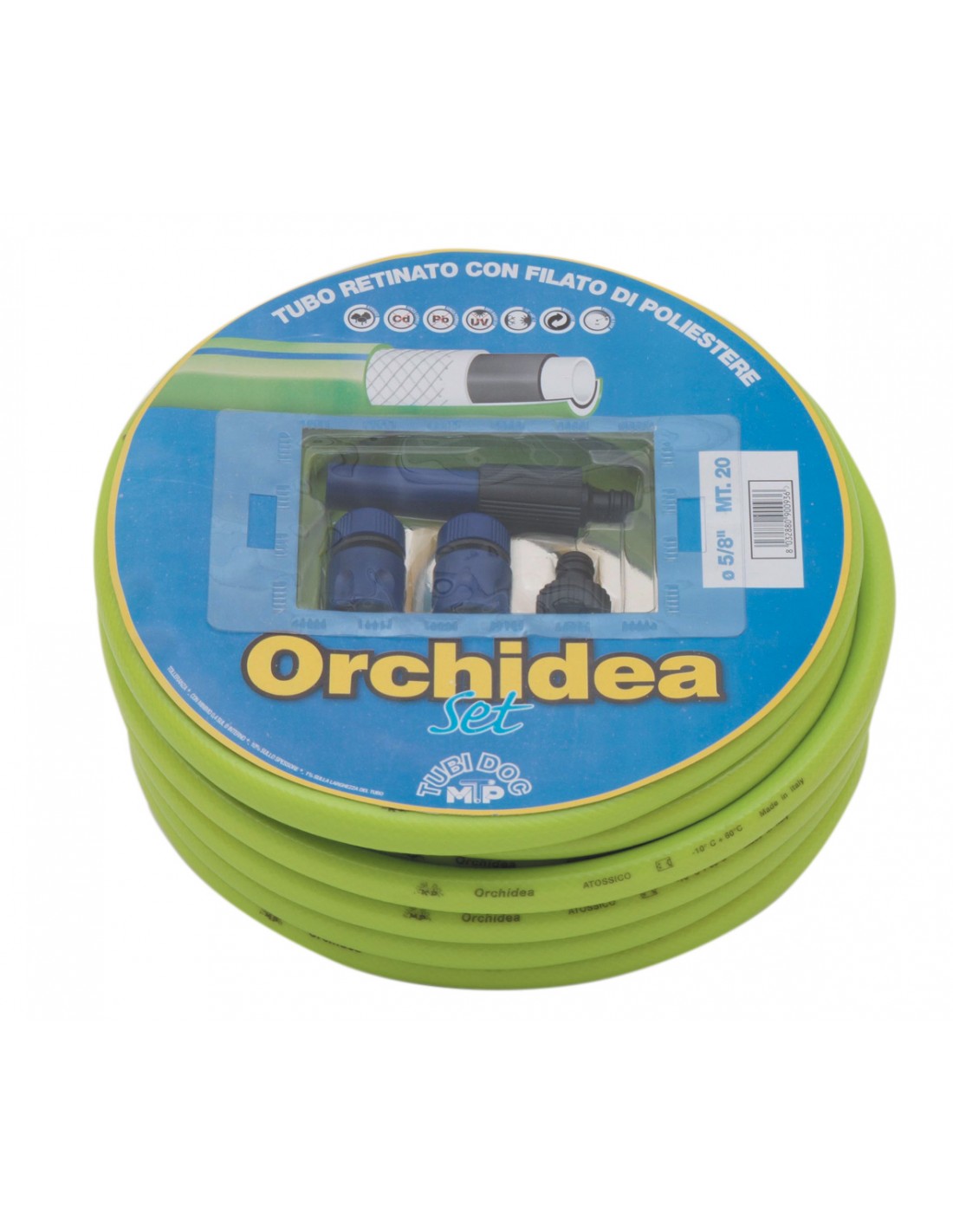 Il tubo da giardino Orchidea è un kit attrezzato composto da un tubo retinato a 5 strati da 5/8 lungo 20 metri, lancia e raccordi. Resistente alle intemperie