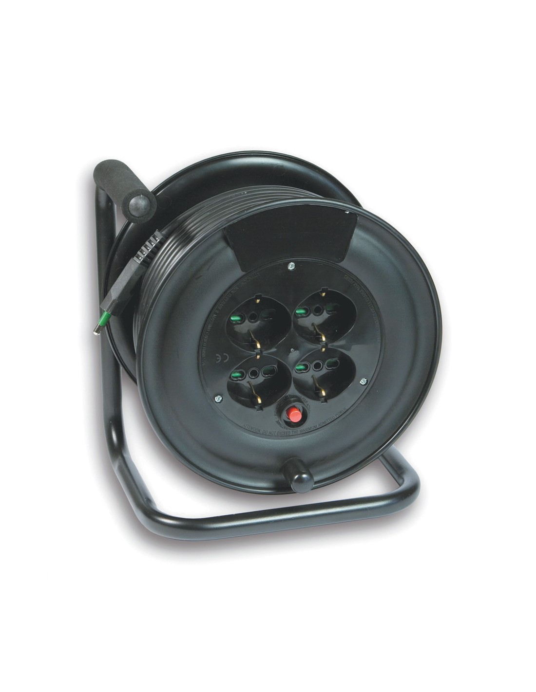 Art. 14.613 Serie Onda. Supporto in metallo. Spina 16A 2P+T. E 4 prese bipasso 2P+T 10/16A. Sezione cavo 3x1,5 mm HO5VV-F. Lunghezza cavo 50 m. Con disgiuntore termico provvede a staccare automaticamente la corrente dal blocco prese in caso di surriscaldamento sia a cavo avvolto che svolto. Il ripristino avviene mediante pressione del pulsante rosso.