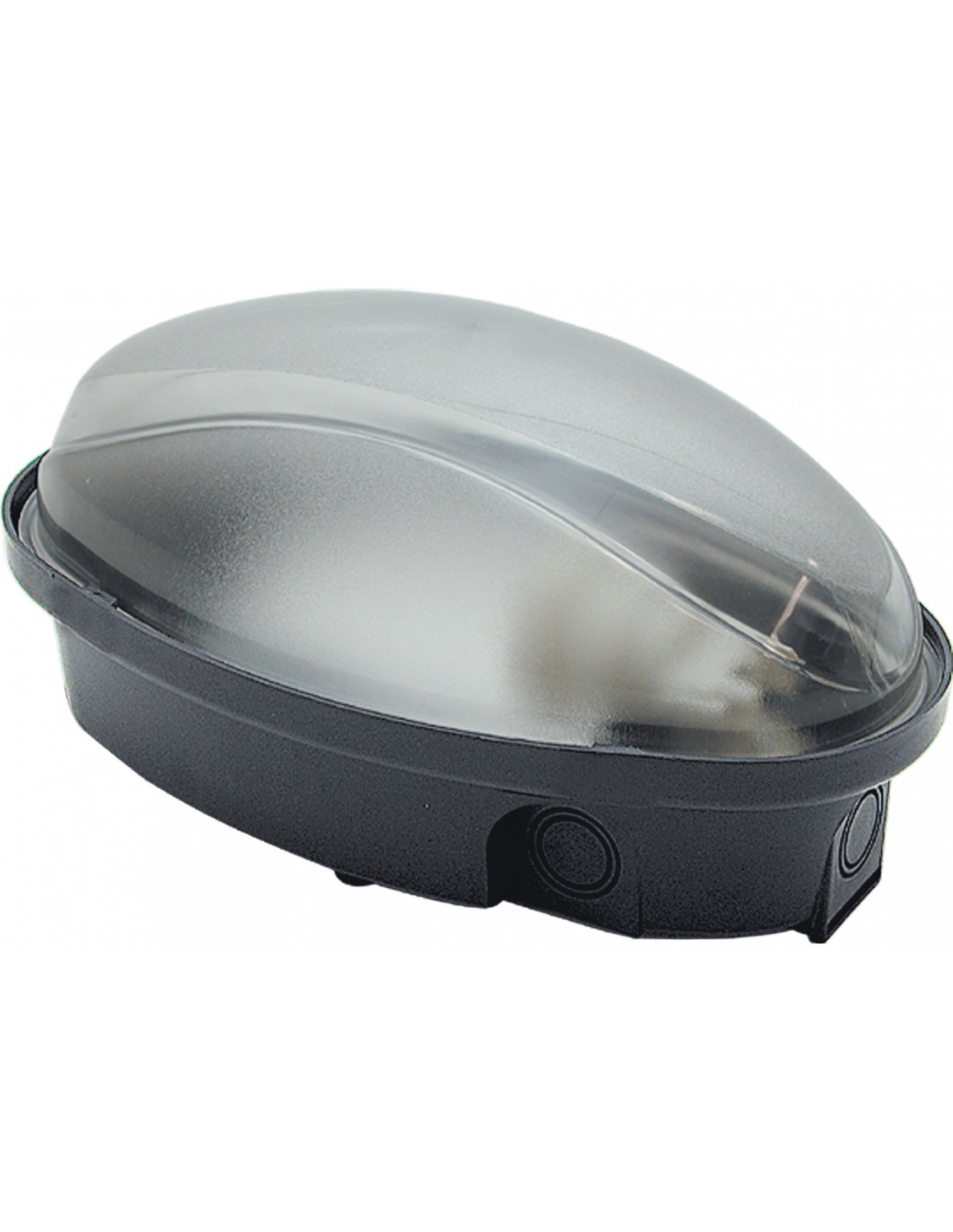Art. 62.721 corpo in materiale termoplastico e calotta in policarbonato opalino. A norme EN 60598-1 e EN 60598-2-1. Portalampada E27 (attacco grande) per lampade ad incandescenza (max 60W) o a basso consumo (max 11W). Grado di protezione IP65. Base 215x125xh110 mm. Colore nero.