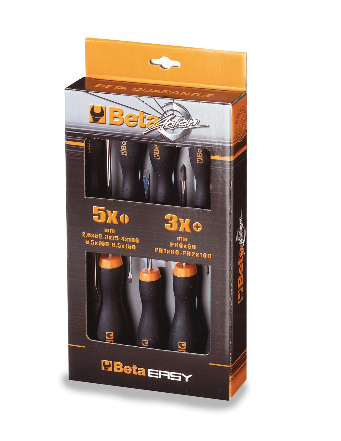 Art. 1203/D8 P serie 8 giraviti in acciaio al cromo vanadio, punta nera. Impugnatura bimateriale. Composta da -Art. 1201 ( diametro x lunghezza mm 2,5x50 - 3x75 - 4x125 - 5,5x150 - 6,5x150 ) -Art. 1202 ( diametro x lunghezza mm 3x60 - 4,5x80 - 6x