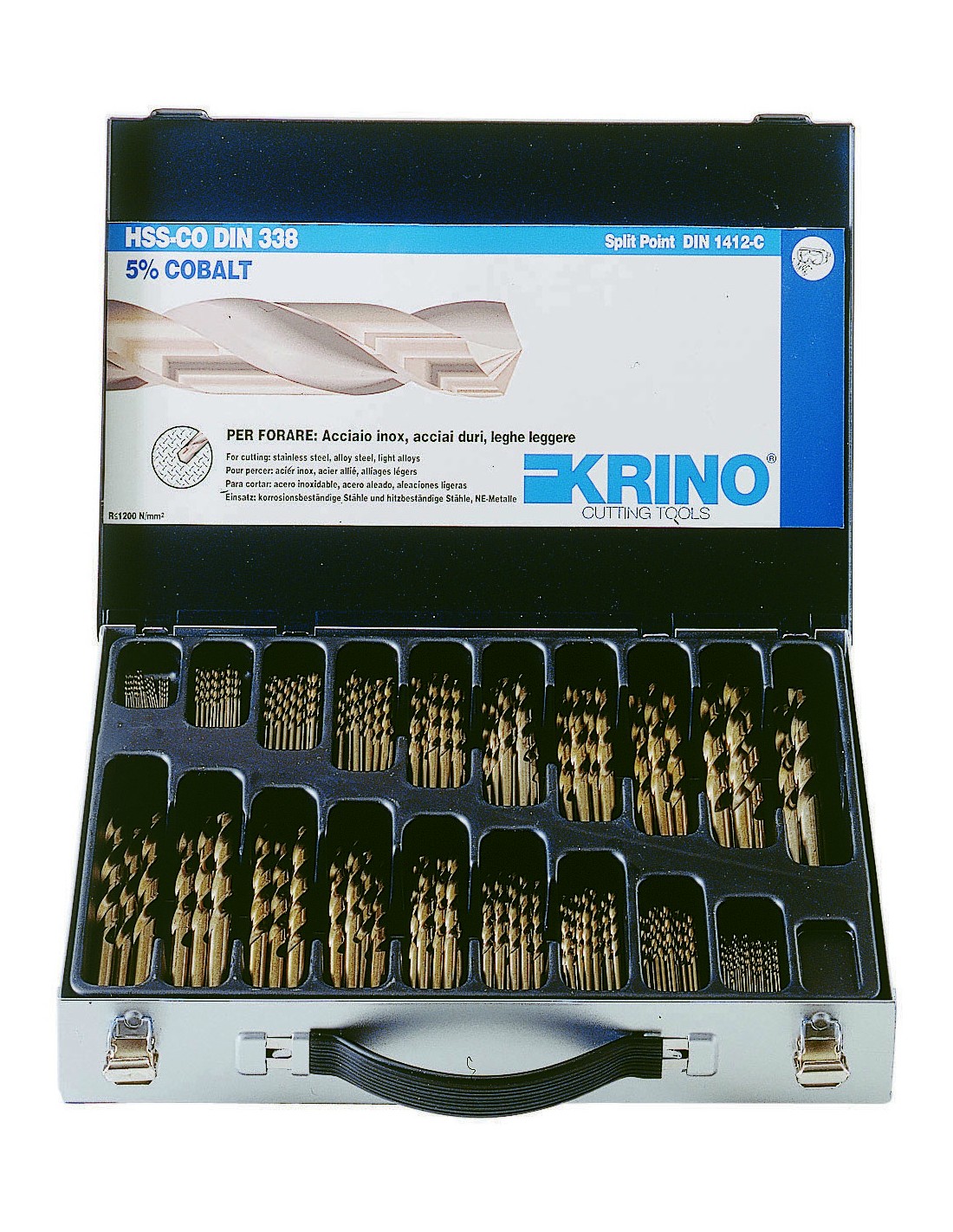 Cassetta con 116 punte assortite. Diametro 110 mm x 0,5 High Quality cos divise da 1 a 5, 10 pz - da 5,5 a 8, 3 pz - da 8,5 a 10 2 pz.