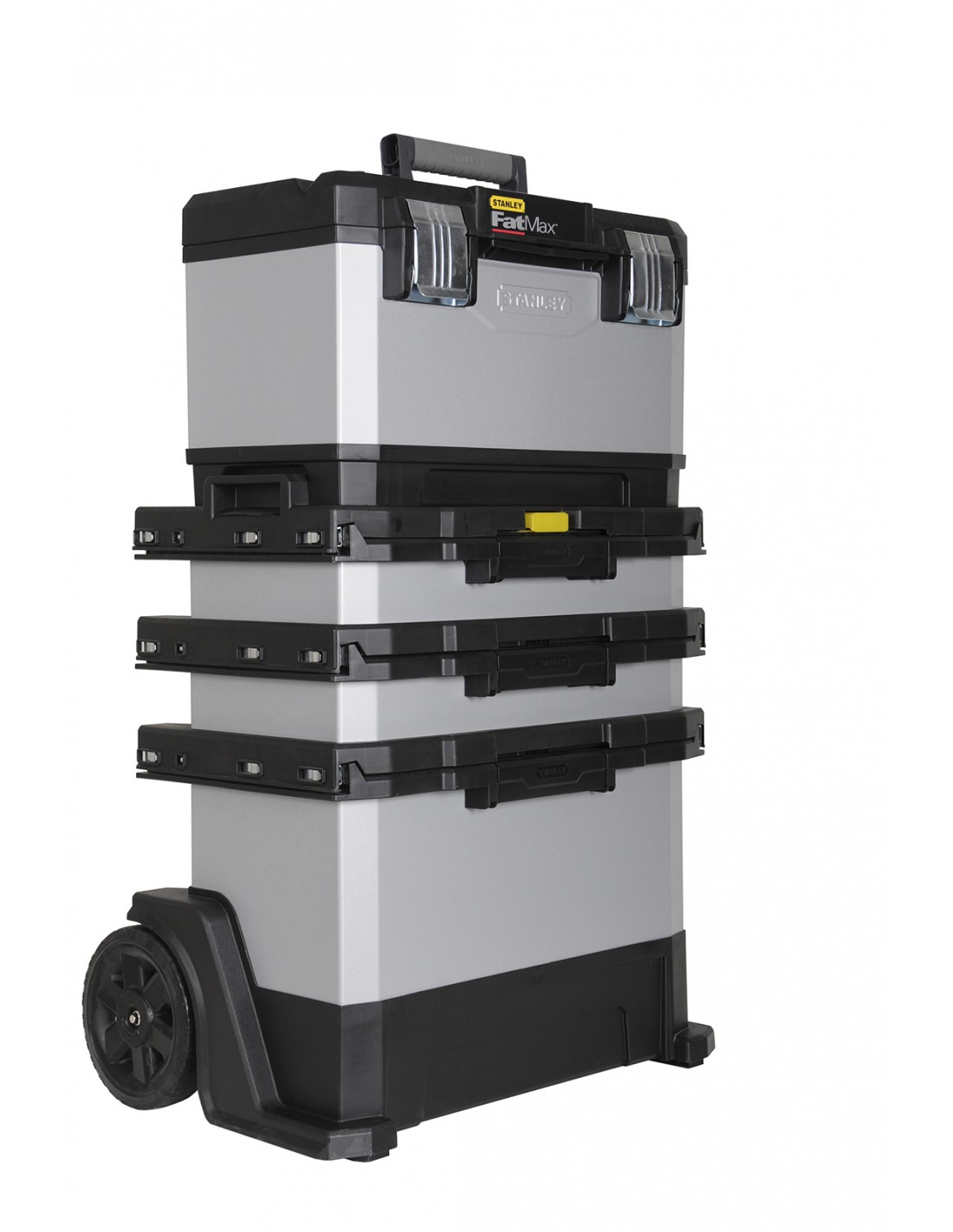 Art. 1-95622 FAT MAX In metallo e polipropilene. Composto da cassetta, due cassetti ed ampia base. Cassetta superiore con coperchio scanalato e vaschetta estraibile. La cassetta separabile con la semplice pressione di un bottone. Cassetti con guide in acciaio con cuscinetti a sfera, per scorrimento morbido e grande capacit di carico. Base fissa con 2 grandi ruote. Maniglione telescopico. Base e cassetto si aprono con facilit formando una postazione di lavoro. Asole per chiusura a lucchetto. Capacit 71,6 litri. Dimensioni 568 x 389 x h 893 mm. Peso 16,4 kg.