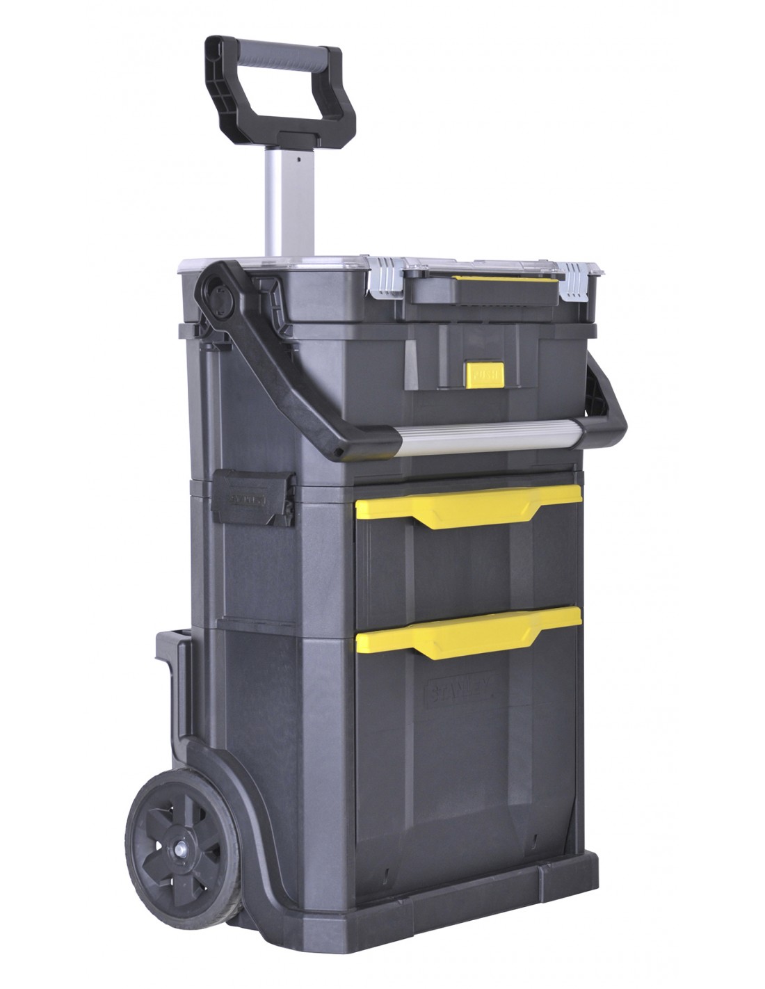 Art. STST1-79231 Rolling Workshop Set mobile 2 in 1 in polipropilene, composto da - Cassetta superiore modello Top Edge con organizer separabile tramite la semplice pressione di un bottone, con cerniere di chiusura in metallo, coperchio in policarbonato e maniglione reclinabile in metallo. Base con 1 cassetto con guide scorrevoli in acciaio con cuscinetti a sfera e vano per apertura basculante. Con 2 ruote e maniglione telescopico per il trasporto e tasche posteriori per lalloggiamento di utensili lunghi (livelle). Portata max 35 kg. Capacit 43,4 litri. Dimensioni 567 x 382 x h 764 mm.