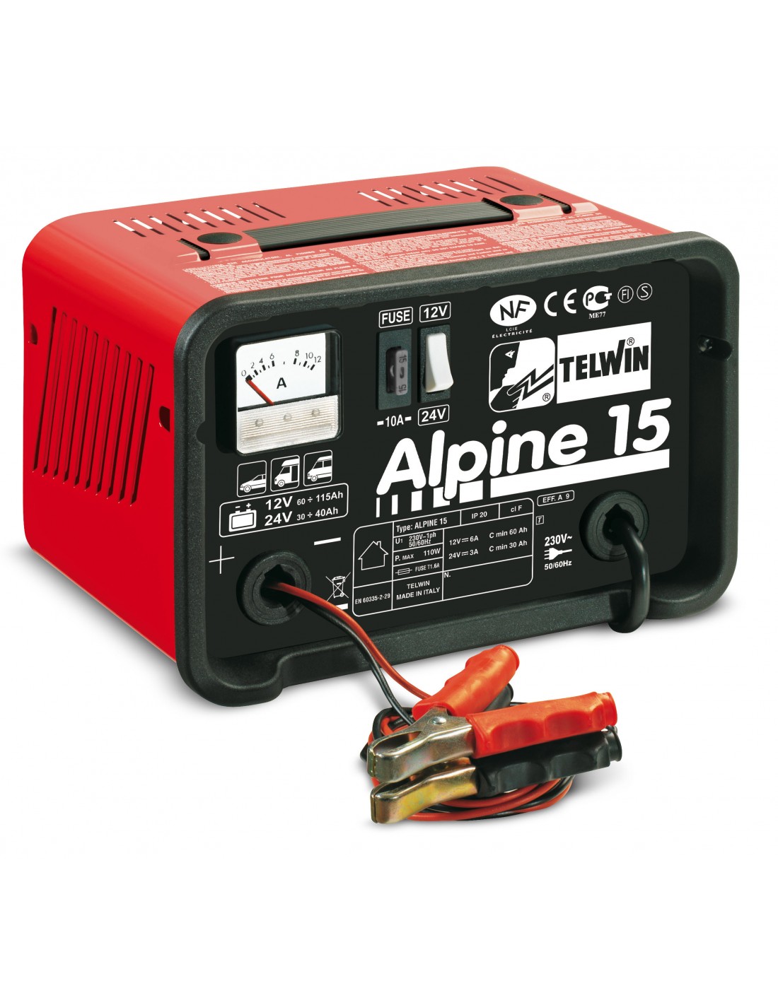 Il caricabatteria Telwin Alpine 15 è ideale per la carica di batterie ad elettrolita libero (WET) con tensione di 12/24V con protezione contro sovraccarichi ed inversioni di polarità. E' dotato di amperometro e fusibile da 10A. E' fornito di pinza polo positivo (rossa) e pinza polo negativo (nero) e cavi. Grazie alle sue dimensioni, 17x25x16.5 cm, e al suo peso di soli 3,5 kg, è facile da trasportare e da conservare.