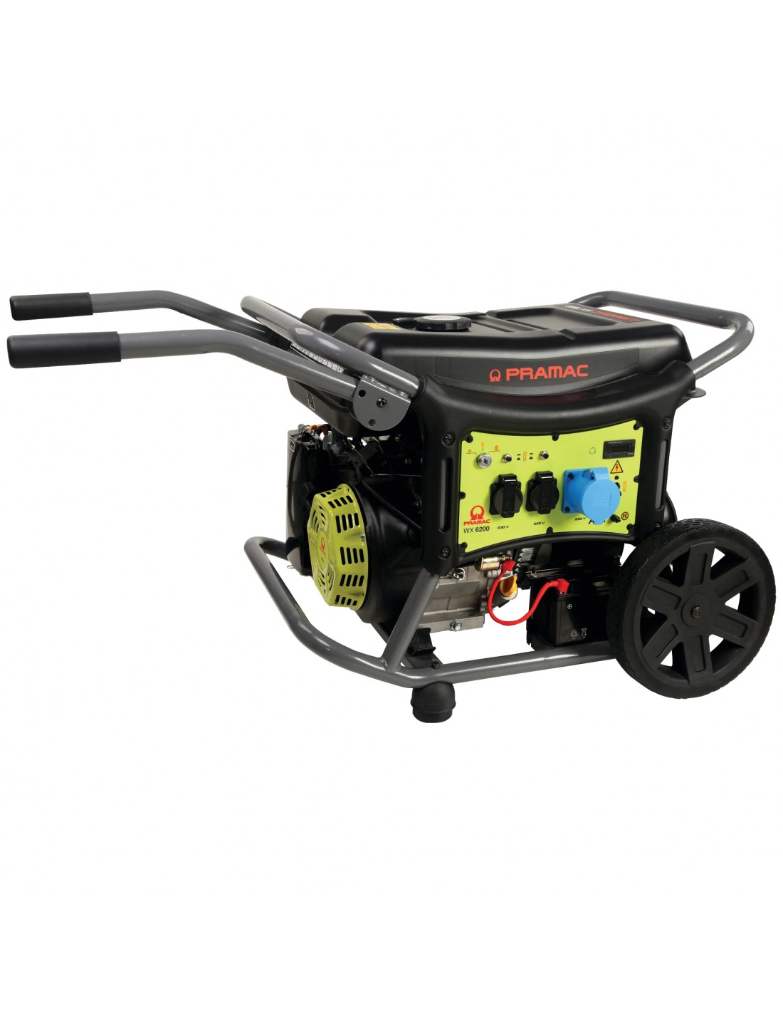 Mod. WX 6200 ES. Tensione 230V - 50 Hz - Fasi 1 - Potenza Massima 5.800W - Potenza Nominale 5.300W - Numero giri motore RPM 3.000. Capacit carter olio 1,1 l. Carburante Benzina. Capacit di serbatoio 26 l. Bottiglia con oilo motore e imbuto per semplificare la messa in funzione del generatore. Consumo carburante 50 2,17 l/h. Autonomia al 50 del carico 12 ore. Motore Powermate OHV alimentazione costante per molteplici applicazioni. Sistema di avviamento elettrico (con batteria) + strappo con avvolgitore. Pannello di controllo integrato con chiave di avviamento OFF - ON - START, Voltimetro. Frequenzimetro. Conta-ore. Protezione basso livello olio motore. Indicatore livello carburante. AVR Regolatore elettronico della tensione. Uscita connettore per AMF. 2 Prese schuko 230V - 16A - IP44. 1 2P+T CEE 230V - 32A - IP44. Kit di trasporto completo di ruote e maniglie. Predisposto per opzione quadro intervento automatico ATS (accessorio non compreso). Rumorosit 97 dB. Dimensioni 800x698xh 620 mm. Peso 8