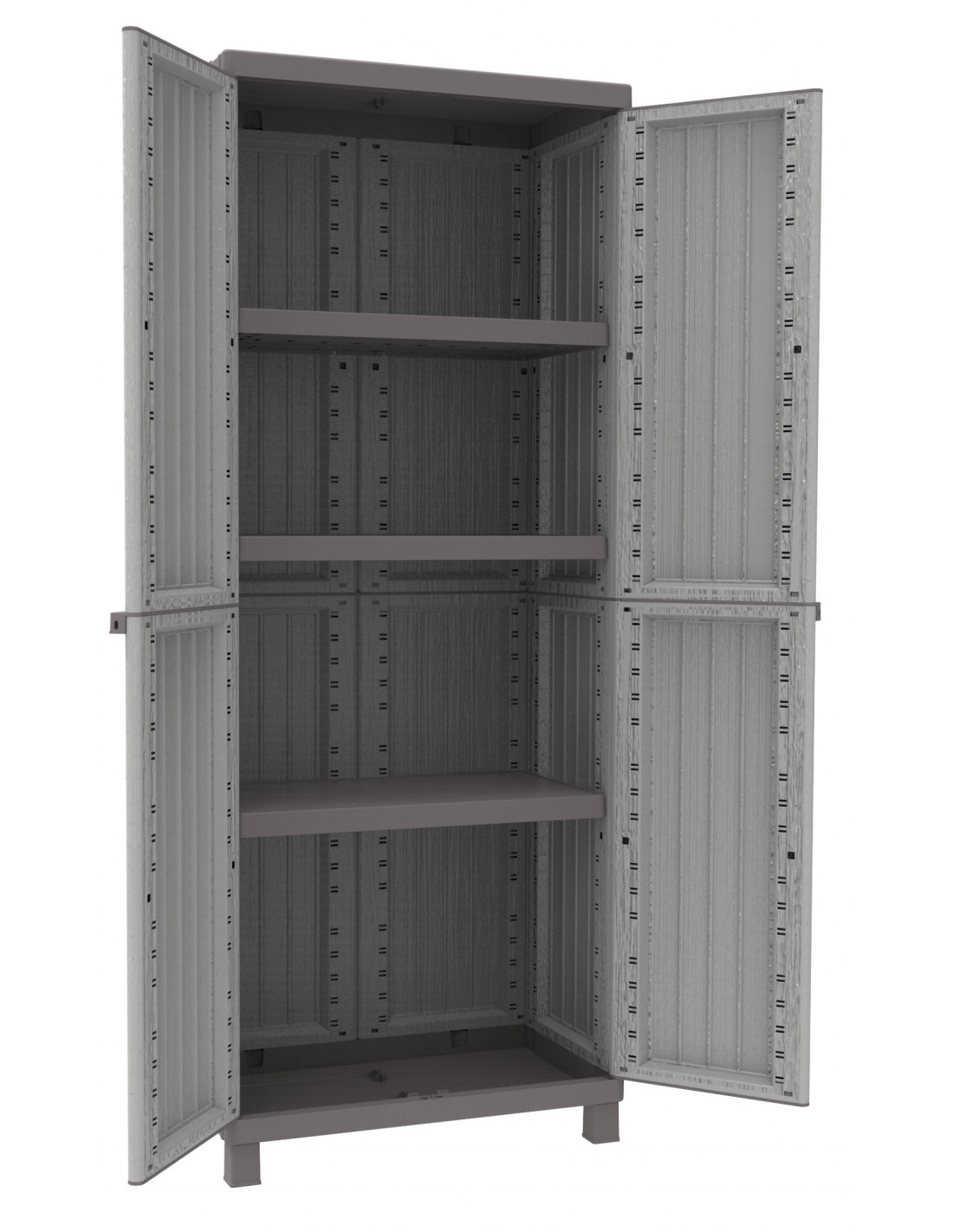 multifunzionale Serie C-WOOD Art. TP2680 in polipropilene. Finitura effetto LEGNO. Ottima resistenza agli agenti atmosferici. Doppia anta con apertura a 180. 3 ripiani interni regolabili in altezza. Dotato di piedini. Portata ripiano max 20 kg (uniformemente distribuiti). Possibilit di chiusura con lucchetto (non incluso). Dimensioni 68x39xh170 cm. Peso prodotto 13,251 kg. Dimensioni imballo 80x41xh42,5 cm. Peso imballo 14,921 kg.