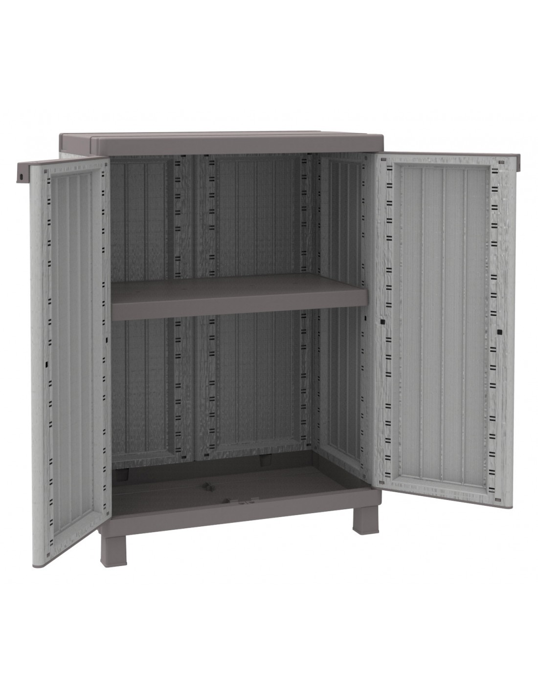 multifunzionale basso Serie C-WOOD Art. TP680 in polipropilene. Finitura effetto LEGNO. Ottima resistenza agli agenti atmosferici. Doppia anta con apertura a 180. Ripiani interno regolabili in altezza. Dotato di piedini. Portata ripiano max 20 kg (uniformemente distribuiti). Possibilit di chiusura con lucchetto (non incluso). Dimensioni 68x39xh91,5 cm. Peso prodotto 7,469 kg. Dimensioni imballo 80x40xh27,5 cm. Peso imballo 9,139 kg.