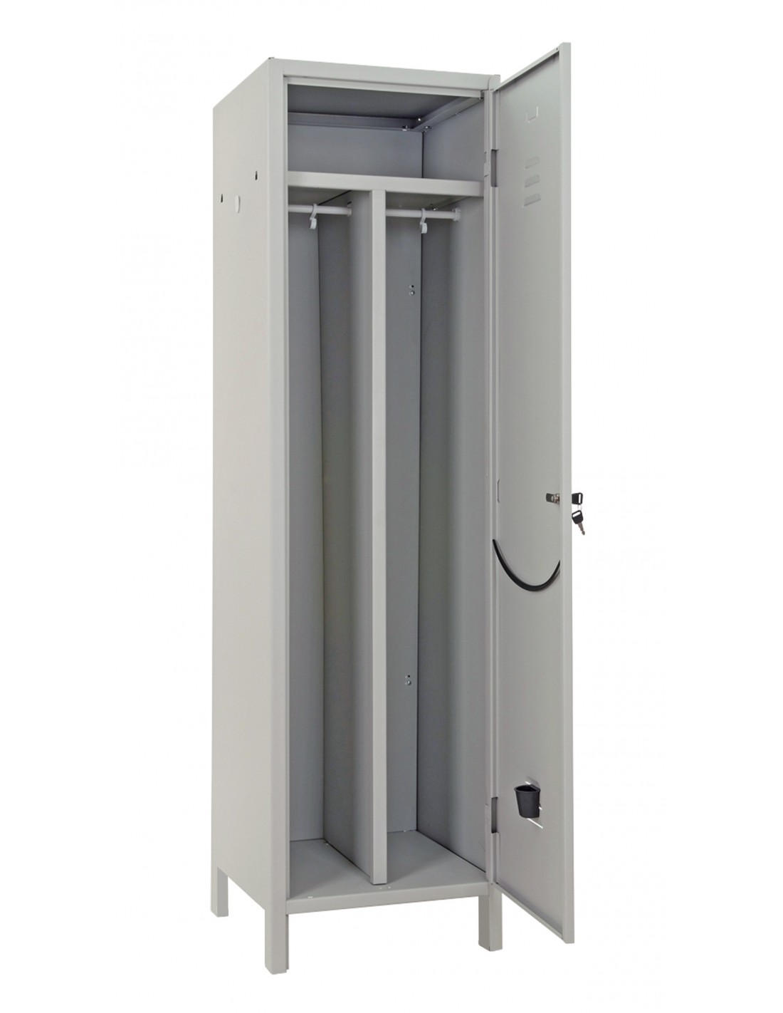 Mod. SPORCO/PULITO SLIM in lamiera di acciaio verniciata. Anta singola con feritoie areazione e portacartellino. Chiusura con serratura. Appendiabiti, portasciugamani, portaombrello, ripiano interno e paratia centrale. Dimensioni 50x50xh179,5 cm. Colore grigio.