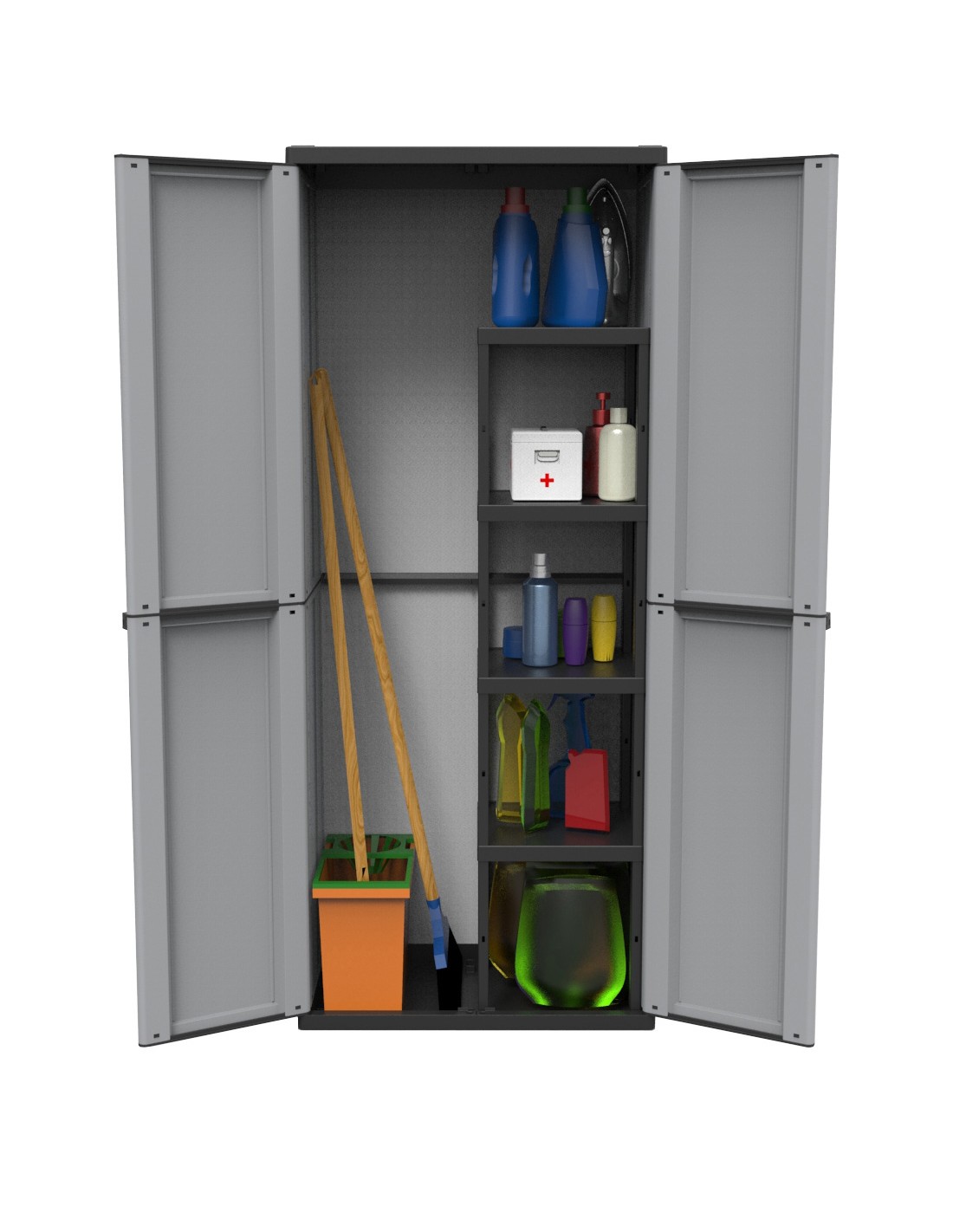 multifunzione Serie J-LINE Art. 368 in polipropilene. Ottima resistenza agli agenti atmosferici. Doppia anta con apertura a 180 su vano porta scope e scaffalino a 4 ripiani interni. Portata ripiano max 10 kg (uniformente distribuiti). Possibilit di chiusura con lucchetto (non incluso). Dimensioni 68x37,5xh 163,5 cm, Dimensioni imballo 80x41xh36 cm.