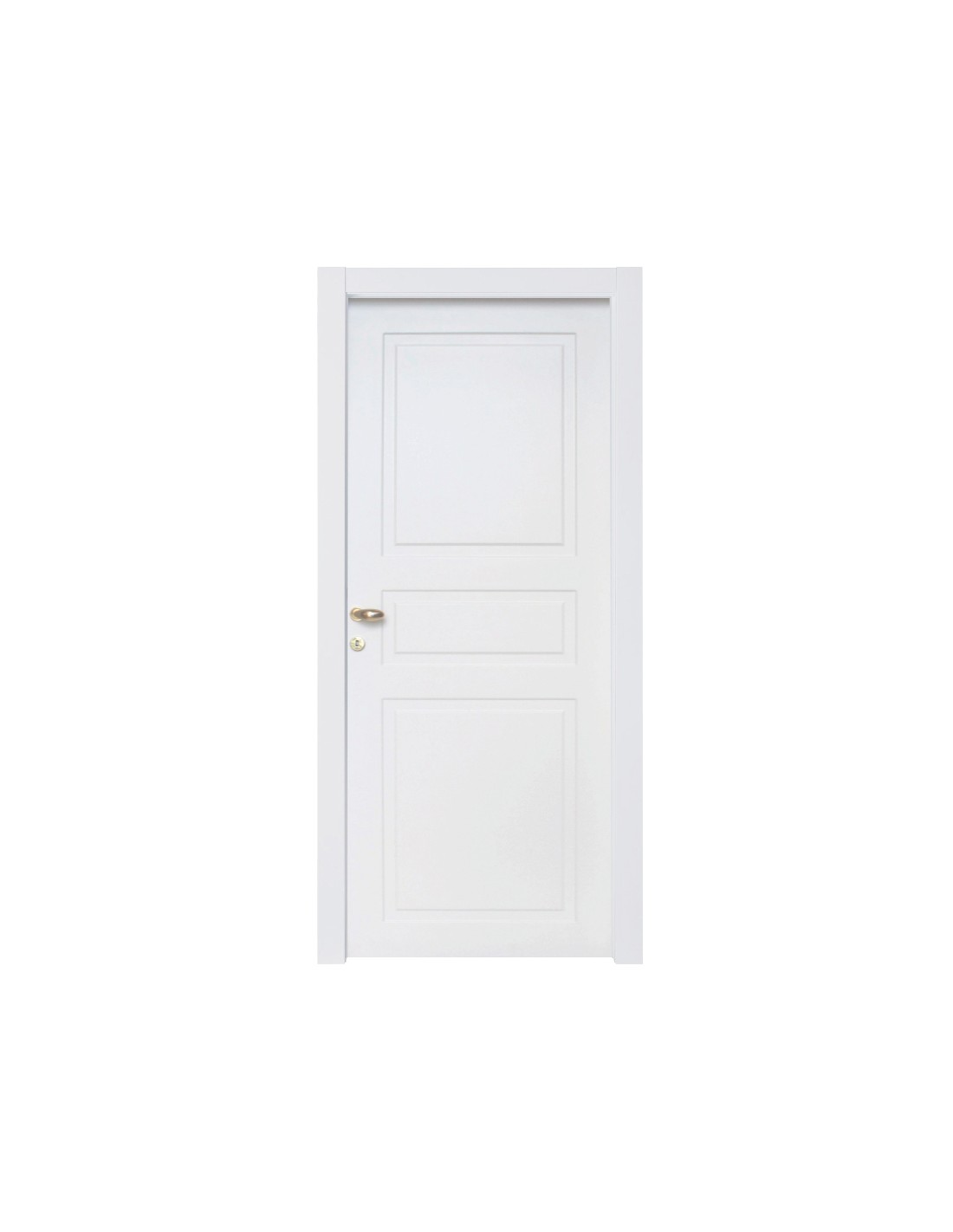 Porta a battente reversibile. Telaio perimetrale compreso di rinforzi in massello di abete. Riempimento in cartoncino trattato. Piani in MDF da 8 mm. Bordatura sui 4 lati in carta melaminica neutra. Composta da: Anta, Telaio completo di traverso, coprifili. Serratura verniciata silver e cerniere coassiali anuba Ø 13 mm maschio-femmina zincate (montate). Maniglia non inclusa. Dimensioni 80 x h 210 cm. Finitura bianco laccato.