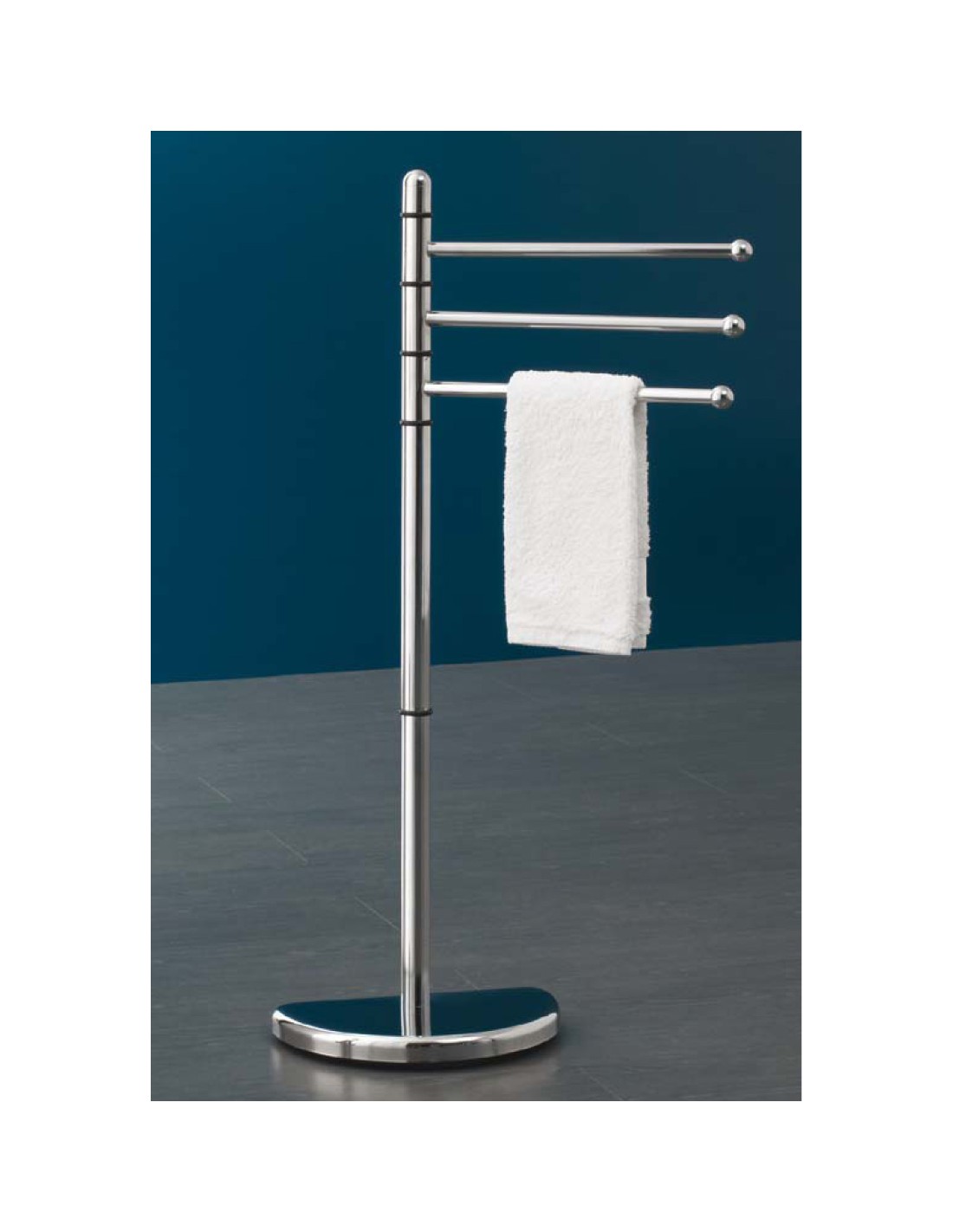 con base semicircolare salvaspazio ideale per il tuo bagno. In metallo cromato con tre braccetti girevoli, ideale per piccoli spazi. Dimensioni 36,5 x 30 x h 90,5 cm. Art. HI31