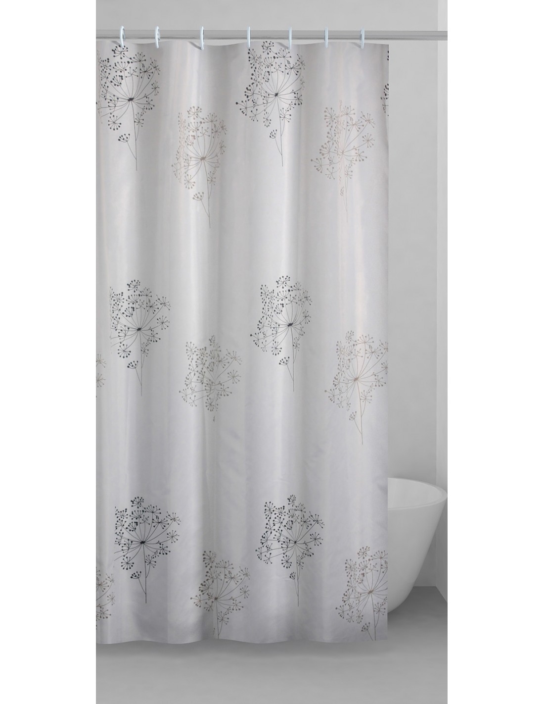 realizzata in poliestere. Completa di anelli. L'orlo inferiore contiene un filo di polipropilene per mantenere la tenda sempre tesa. Dimensioni 180 x 200 cm. Colore bianco, nero. Disegno parfume'.