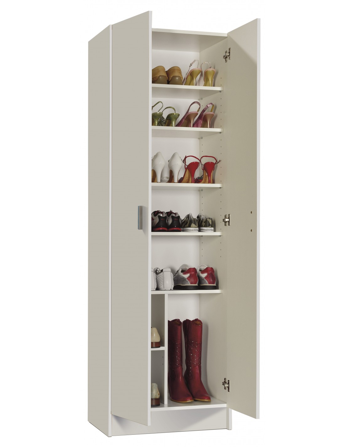 LINEA MULTIUSO Slim. Mobile con pannello in truciolare melaminico a due ante e sei ripiani spessore 15 mm. Maniglie colore grigio metallizzato. Tacchetti antirumore e cerniere con apertura a 105コ. Dimensioni 58,5 x 37 x h 180 cm. Colore bianco. Da assemblare.