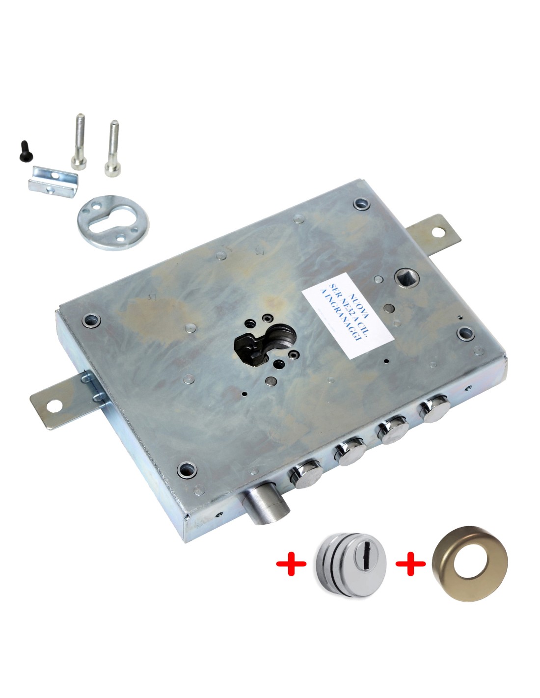 Art. NE 42 S mano SX chiusura triplice con 4 catenacci e scrocco reversibile. Scatola mm 142x206Entrata 60 mm.Confezione in scatola con defender e bocchetta.